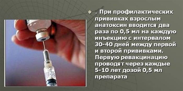 - Если с момента последней ревакцинации прошло больше 20 лет (пропущен плановый визит), врач ставит 2 дозы АДСМ по 0,5 мл с месячным интервалом.