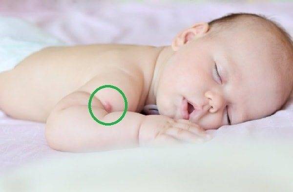 Фото 1. Изображён спящий ребёнок, зелёным цветом на его плече обведена папула от прививки БЦЖ.